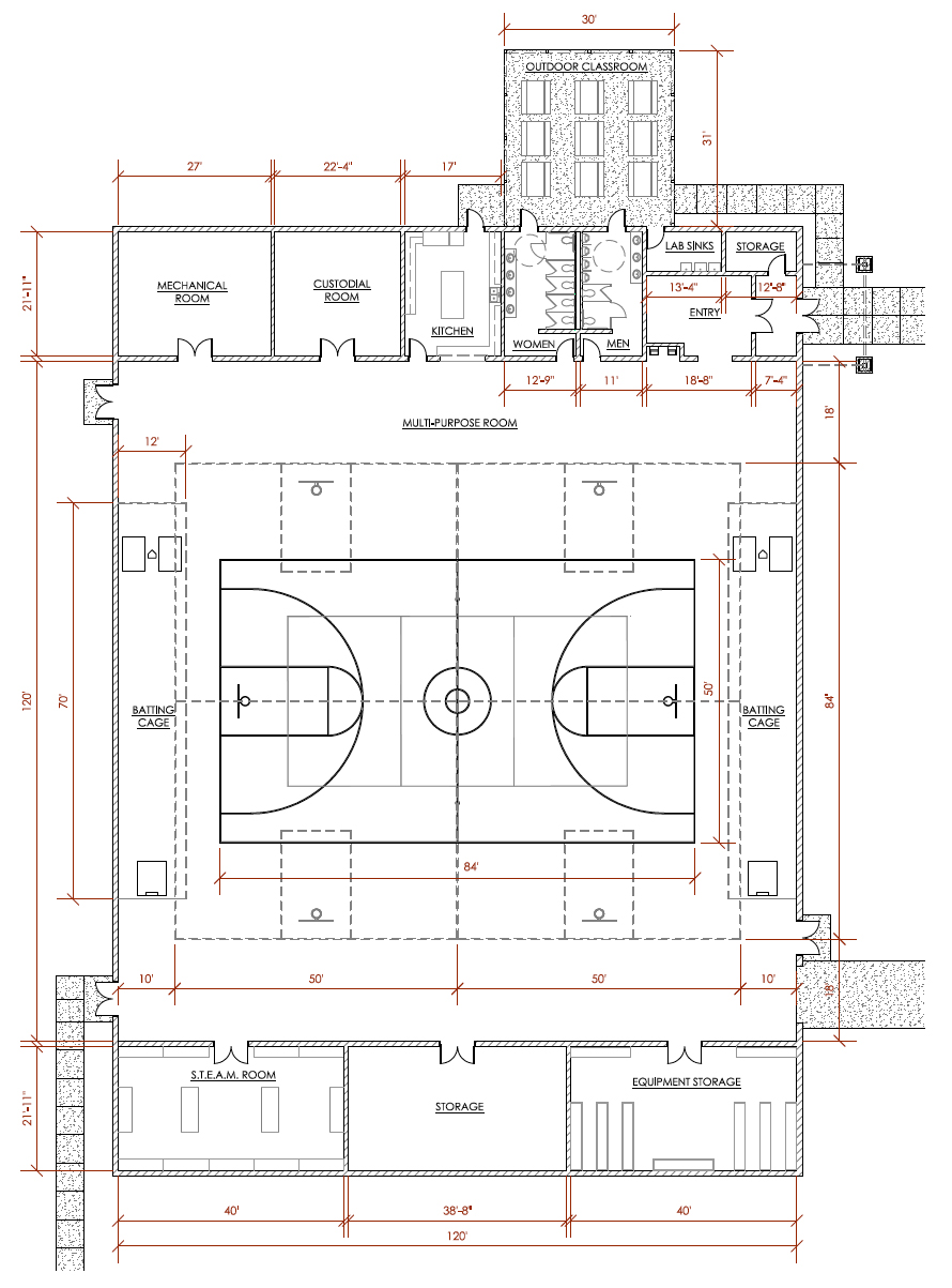 Located west of the south parking lot, will be a versatile 120’ x 164’ facility, supporting everything from indoor team practices to STEAM experiments to archery practices.